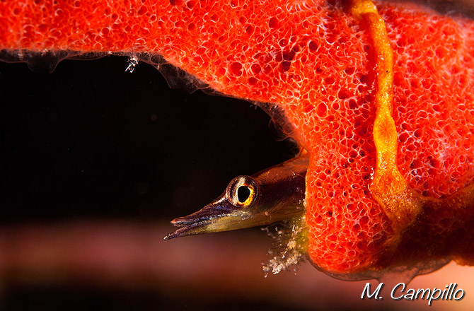 Este pequeño cazador de no mas de 5 cm de longitud tiene un cuerpo alargado de color rojo translúcido que termina en un hocico puntiagudo con el que atrapa diminutos peces. Habita en El Caribe, incluyendo Las Antillas.
