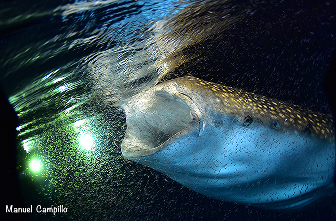 Cae la noche sobre los atolones de Maldivas. Después de un día intenso de buceo nos vamos a descansar. A las 2 de la madrugada algunos gritos y golpes en las puertas de los camarotes nos despiertan: ¡¡TIBURÓN BALLENA!!. Atraídos por los potentes focos que iluminan el agua nocturna, una gran concentración de plancton, sobre todo krill, ha teñido el agua de rojo. En una danza que nos deja atónitos, un enorme tiburón ballena emerge de las profundidades una y otra vez con el aspecto amenazante que le confiere su gran boca abierta a través de la cual engulle litros y litros de agua cargados de alimento. Al poco rato ya había dos ejemplares.