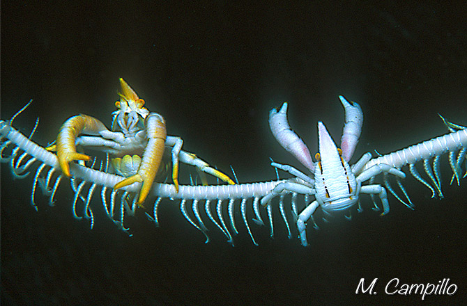 Los cagrejos galatea son habitantes comunes en el arrecife que normalmente pasan desapercibidos por su pequeño tamaño, 2 cms., porque son activos de noche y algunas especies viven camuflados en otras especies mayores. Tienen caparazones ovalados y rostros afilados y sus grandes quelípedos nos recuerdan a diminutas langostas.