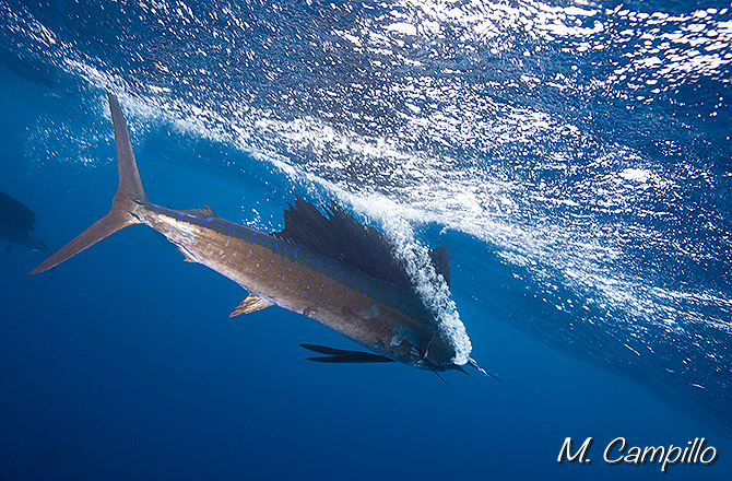 A menudo se le confunde con el marlín o con el pez espada con los que tiene en común sus espectaculares saltos fuera del agua. Como se aprecia en la foto, una vez en el agua de nuevo, va liberando el aire acumulado en la boca en su visita a un mundo hostil y diferente a su reino marino.