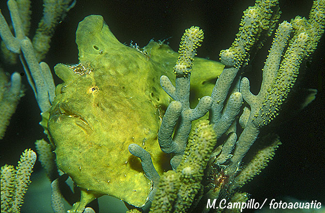 Los peces ranas, como este ejemplar, el Pez Rana Gigante, Antennarius commersonii, son lentos y no poseen espinas venenosas u otras defensas por lo que su posibilidad de sobrevivir es directamente proporcional a la posibilidad de no ser vistos y pasar desapercibidos.