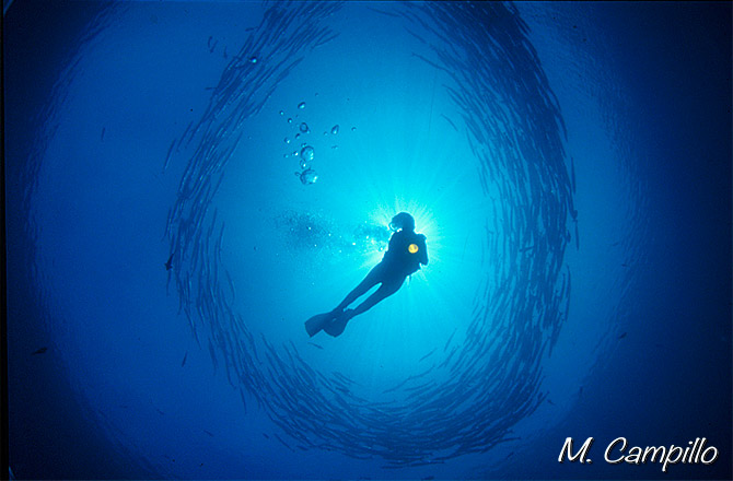 Muchos peces se reunen en grandes bancos lo que facilita sus tareas de crecimiento y supervivencia. Cuando un banco es “atacado”, los individuos que lo componen se estrechan todavía más entre sí en una formación esférica comparable a una bola. Si el supuesto depredador (en este caso yo) insiste en el acercamiento y se va introduciendo entre ellos, los peces comienzan a abrirse hasta formar un círculo perfecto en torno al “enemigo”.