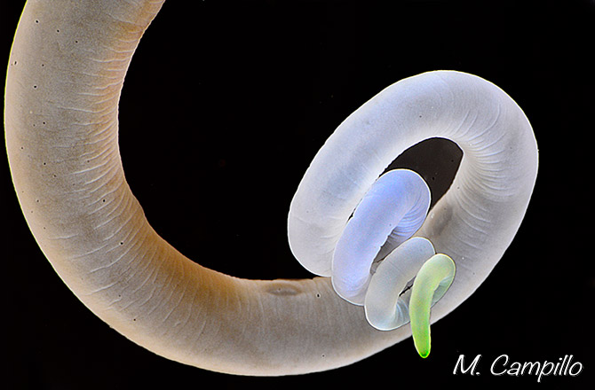 La foto representa un detalle de la Anémona Tubo , Cerianthus menbranaceus, que en su afán por capturar el plancton de que se alimentan estiran, encogen, rizan y revuelven los tentáculos en un baile sincronizado digno de observarse. Pero cuidado con acercarse demasiado. Si sienten cualquier posible amenaza, se retraen y desaparecen rápidamente dentro del tubo en el que viven.