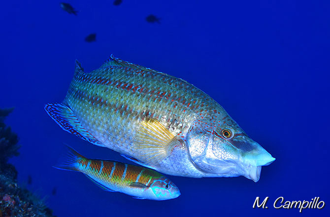Va acompañado de un oportunista de la misma familia, el Fredi, Thalassoma pavo, que aunque a veces actúa como pez limpiador en su etapa juvenil, en este caso iba aprovechando las migajas que se desprendían de los grandes bocados que iba dando el peto en los sedimentos y algas en su búsqueda de alimento.