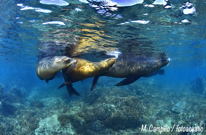 Uno de los buceos mas sorprendentes y entretenidos en el mar de Cortés, cerca de La Paz, es el encuentro a placer con los leones marinos, Zalophus californianus. Al norte de las isla Espíritu Santo, dos grandes islotes albergan una colonia de estos otarios compuesta por mas de 100 individuos donde varios machos soportan harenes compuestos por unas 15 hembras por cabeza.