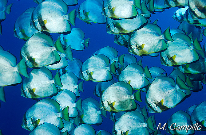 Se les suele ver en parejas o pequeños grupos cerca de los pecios o de los cabezos de coral. Pero en otras ocasiones se agrupan en densos bancos, cerca de la superficie, para moverse por el exterior de los arrecifes. Estos grandes grupos toman diversas y diferentes formas que a mucha distancia los hace confundir con grandes criaturas marinas como estrategia de defensa en sus viajes por las peligrosas aguas abiertas.