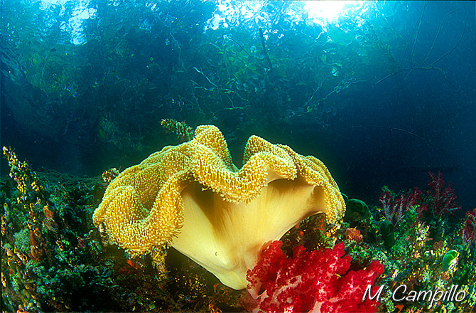 “El bosque submarino” de un arrecife de coral se confunde con las sombras de los árboles de la selva tropical que parece querer sumergirse en el agua. En un juego de luces y sombras y entre una paleta de variados colores… verdes, amarillos, rojos, y azules, un coral cuero se presta, con su original forma de jarrón, a recoger cualquier hoja perdida de sus compañeros los árboles que se pudiera desprender y caer.