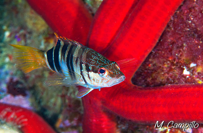 Habita normalmente los fondos rocosos y las praderas marinas hasta una profundidad de 30 metros, alimentándose de pequeños peces, crustáceos y otros invertebrados. Es tremendamente territorial defendiendo agresivamente su espacio incluso ante ejemplares de la misma especie. Es hermafrodita como todos los serránidos y en el caso de esta especie, hermafrodita simultáneo, es decir que puede hacer las funciones macho y hembra al mismo tiempo. Esta peculiaridad unido a su pequeño tamaño, no más de 30 cm, esperemos ayude a seguir disfrutando de su presencia en las inmersiones.