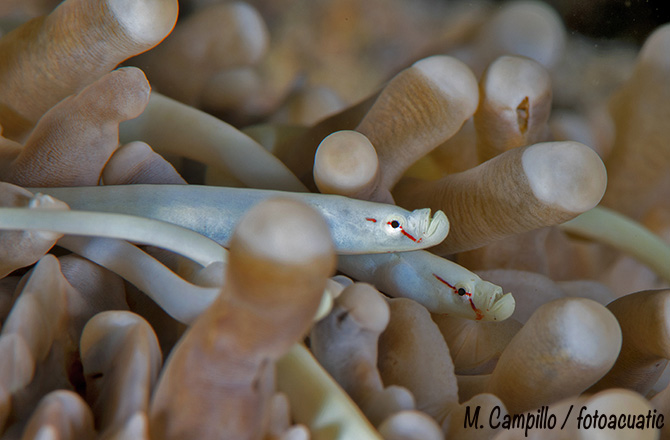 Este curioso pez, Siokunichthys nigrolineatus, totalmente blanco y con aspecto de gusano, se desplaza horizontalmente entre los pólipos de los corales seta en los que vive. En este caso, se trata del coral Heliofungia actiniformis, que por el aspectos de sus pólipos puede ser confundido con una anémona. ¡Nada es lo que parece¡.