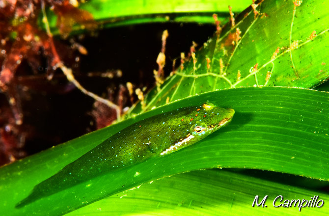 Con sus aletas ventrales modificadas se adhiere a las hojas de Posidonea y Cymodocea donde su intenso color verde le proporciona un asombroso camuflaje. Pero cuando diferentes incrustaciones de invertebrados cubren las hojas verdes de manchas rosas y blancas, él no duda en cubrir su lomo con este mismo disfraz e ir cambiando su color según va cambiando el aspecto de las hojas.
