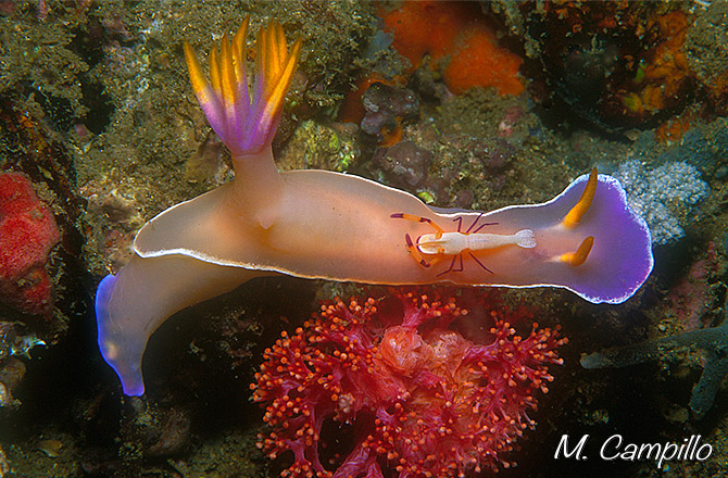 Es más frecuente sorprenderla en las holoturias o en el nudibranquio conocido como bailarina española, pero en este caso ha decidido instalarse en Hypselodoris bullockii y convertirse en su “ocupa”. Se alimentan de los restos fecales y los mucus del molusco al que mantienen siempre limpio y en todos los casos, adquieren la coloración del animal sobre el que viven en un auténtico prodigio de perfecto camuflaje.