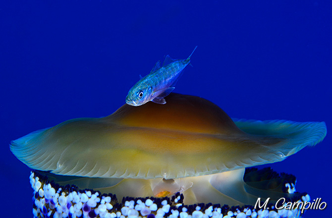 La medusa huevo frito Cotylorhiza tuberculara, con su bonito color y su umbrela aplanada con una elevación en forma de cúpula en el centro (de donde le viene su nombre vulgar) surca los mares arrastrada por las corrientes. A menudo van acompañadas de alevines de jureles que se esconden y protegen de los depredadores entre sus bonitos tentáculos rematados por botones violetas y blancos.