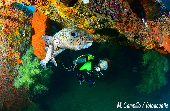 Los barcos hundidos son el refugio habitual de numerosas especies marinas que encuentran en ellos multitud de recovecos donde esconderse. En este caso el pez erizo, Diodon hystris, sorprendido por la buceadora intenta pasar desapercibido en el entramado de la estructura del pecio.
