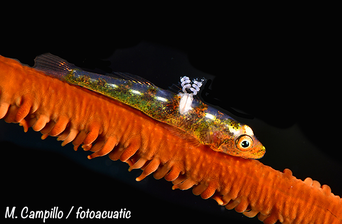 Son unos diminutos crustáceos que constituyen la mayor parte del plancton oceánico. Sin embargo, algunos de ellos son parásitos que infestan un amplio rango de animales marinos, sobretodo cetáceos, peces y moluscos. En la fotografía, nuestro pequeño individuo, se ha instalado sobre un gobio, Braninops yongei, que vive en el coral látigo.