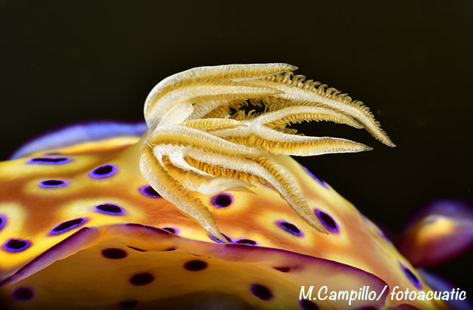 Nudibranquio significa “branquia desnuda” y deben este nombre a que sus “branquias” o estructuras respiratorias para obtener el oxígeno del agua se encuentran en su dorso completamente expuestas. En algunas especies tienen forma de penacho en la parte posterior del manto (como el caso de la foto) y en otras son una especie de apéndices repartidos por todo el dorso.