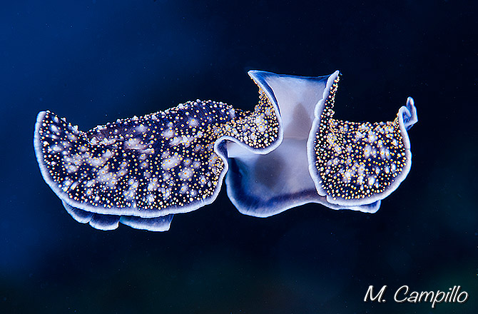 La foto tomada en Filipinas muestra una especie que alcanza los 7 cm. Thysanozoan Nigropapillosum que tiene el dorso cubierto de papilas punteadas de amarillo. Normalmente se le ve arrastrándose sobre el sustrato, pero también puede nadar elegantemente mediante movimientos ondulantes de su cuerpo para desplazarse más largas distancias o para huir cuando es molestado.