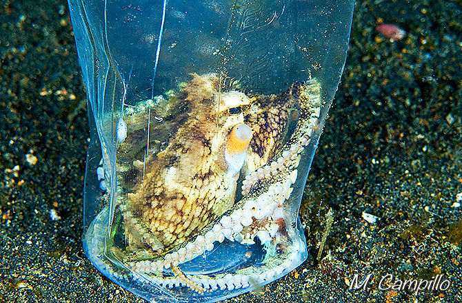 En el estrecho de Lembeh en Indonesia habita una curiosa criatura, el Pulpo de los Cocos, Octopus marginatus, que vive en el lodo y la arena donde hay poca protección frente a los depredadores, por lo que ha desarrollado un método perfecto para hacerse invulnerable. Consiste en esconderse entre dos medias cáscaras de coco que transporta agarrándolas con las ventosas y asoma entre ellas a medio abrir cuando está parado. Pero ante el mínimo peligro, las cierra sobre si mismo quedando a salvo dentro de una coraza inexpugnable. En nuestras anteriores visitas a la zona, lo habíamos fotografiado de esta guisa, pero la última vez no debió encontrar ningún coco, pero si un asqueroso vaso de plástico. ¡Pobre iluso¡