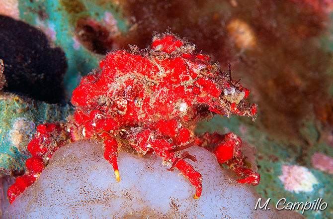 A pesar de su llamativo color rojo no es siempre fácil de detectar debido a su pequeño tamaño (5 cm.) y a que como todos los cangrejos araña, se enmascara con trozos de algas, esponjas, hidrozoos, etc.., mimetizándose perfectamente con el entorno en el que se encuentra.