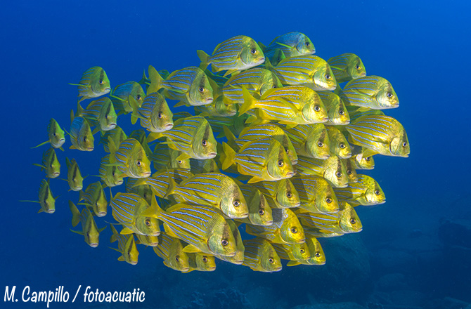 Se desplaza en pequeños y compactos grupos sobre fondos duros de aguas costeras poco profundos entre los 5 y los 25 metros., pero cuando llega la noche, se dispersan por el fondo en busca de pequeños moluscos, crustáceos y gusanos de los que se alimentan.