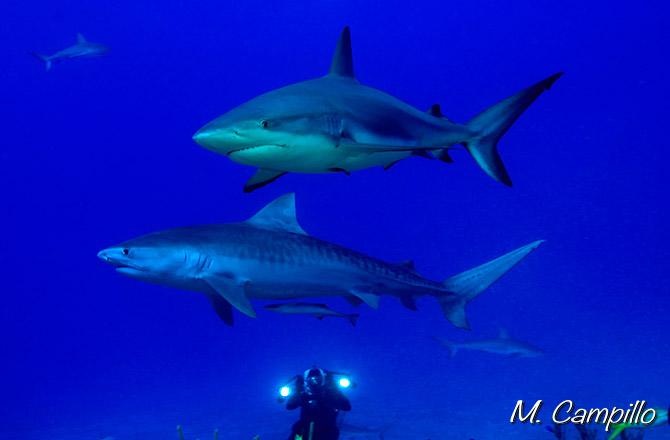 Ante la cámara por un lado un tiburón coralino, carcharhinus perezi, normalmente indiferente con el buceador pero al que hay que acercarse con más cautela ante la presencia de cebos en el agua. Junto a él, un tiburón tigre, galeocerdo cuvier, muy inteligente y el segundo más peligroso para el hombre, que puede alcanzar más de 7 metros de longitud y que debe su nombre a las características estrías en los lomos de los jóvenes como el de la foto y que se suelen perder en la edad adulta.