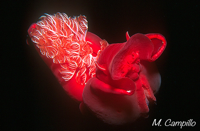 Nuestra protagonista, Hexabranchus Sanguineus, puede alcanzar más de 40 cms de longitud por lo que es el más grande de los nudibranquios conocidos. Posee además otra característica exclusiva respecto a sus congéneres, su asombrosa habilidad para nadar con graciosas ondulaciones de su manto. Esto unido a su intenso color rojo con toques blancos en sus branquias y márgenes, le han dado el apodo por el que se la conoce en el mundo entero “Spanish Dancer”.