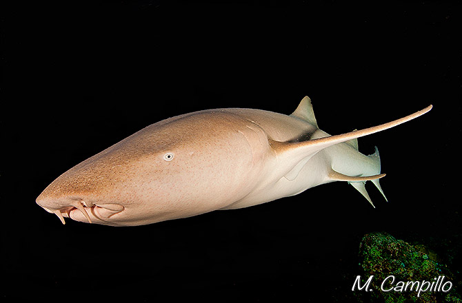 El tiburón nodriza es un animal que tiene costumbres exclusivamente nocturnas y fue precisamente en una inmersión por la noche que nos topamos con este majestuoso ejemplar en aguas de las Islas Maldivas en el Índico. Durante toda la noche recorre activamente el arrecife a la búsqueda de sus presas preferidas, peces dormidos, cefalópodos, crustáceos y equinodermos. La fuerza de su mandíbula es notable, reforzada por el efecto de succión que aplica y que le permite extraer las presas de los recovecos en los que se refugian.