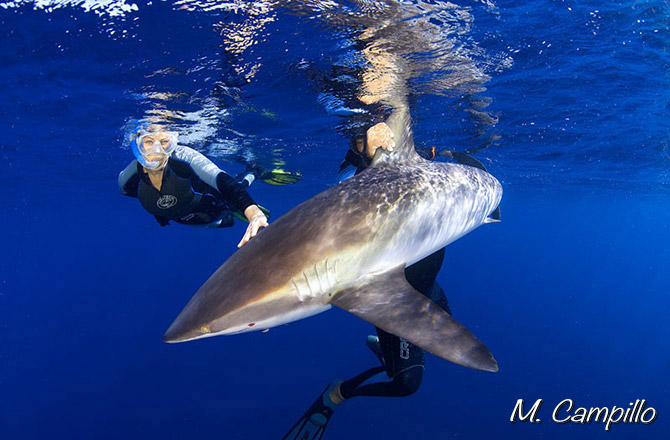 El Tiburón Sedoso, Carcharhinus falciformis es un jaquetón de hábitos pelágicos aunque ocasionalmente se acerca a aguas costeras. Mide habitualmente entre 200 y 250 cm y es fácilmente identificable por su estructura esbelta y su largo hocico redondeado. Su vientre es blanco y el dorso gris, marrón o de color bronce con característicos matices metálicos, debidos al excepcional lustre de su piel, suave al tacto, de donde le viene el nombre vulgar.