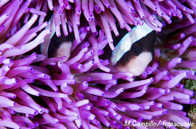 Ya hemos hablado en otras ocasiones en esta sección (FOTO DEL MES), de diferentes especies de los llamativos peces payaso y es que son el tema favorito para los fotógrafos submarinos por la simpatía de su comportamiento, por sus colores hermosos y porque son fáciles de encontrar y fotografiar, siempre viviendo asociados a las anémonas de mar, sus perfectas anfitrionas, en una relación de simbiosis conocida por todos.