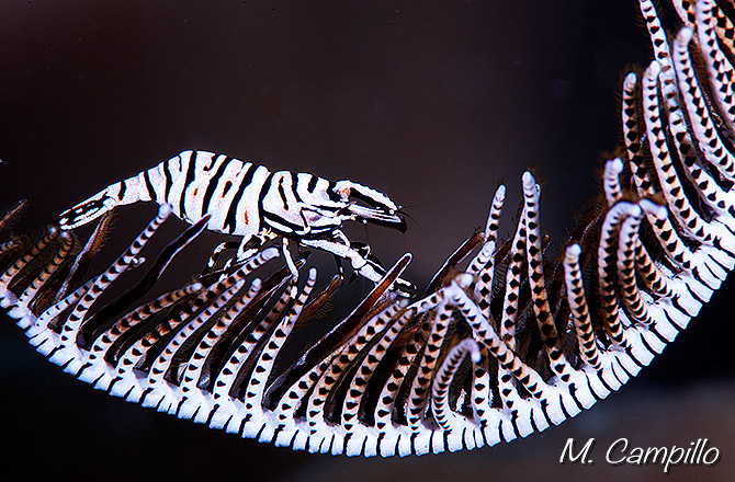 Los crinoideos, conocidos como estrellas de plumas o lirios de mar (ver Foto del Mes de Junio), albergan entre sus brazos a numerosas diminutas criaturas: peces, cangrejos, gambas, etc.. difíciles de ver a los ojos del buceador. Al pequeño tamaño de los "okupas" se añade la dificultad de su perfecto camuflaje dentro de una maraña de brazos que en algunas especies de lirios pueden ser más de 100. No solo adoptan el color de su anfitrión, amarillo, blanco y negro, rojo y blanco, etc.., sino también incluso imitan el dibujo de los brazos de la estrella como se puede ver en esta gamba del género Periclimenes.