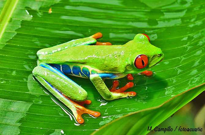 Cuando fuimos a Costa Rica, uno de nuestros objetivos era intentar ver y fotografiar esta llamativa y diminuta rana, uno de los símbolos del país. Y lo conseguimos…. Su coloración llama poderosamente la atención. El verde de su dorso , sus característicos y únicos ojos de color rojo, sus patas naranjas, sus flancos azules…