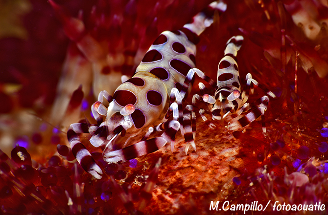 En este caso se trata de la Gamba Comensal Periclimenes colemani, que vive exclusivamente sobre esta especie de erizo, beneficiándose de la protección que le proporciona su espinoso anfitrión. Estas gambas viven siempre en pareja (la hembra es la mas grande) en una zona que han limpiado cuidadosamente de espinas y pies ambulacrales, aunque se pueden mover entre las espinas venenosas sin sufrir daño alguno. Y que se sepa, el erizo tampoco se ve perjudicado por tan diminutos huéspedes, pero en principio no obtiene de ellos ningún beneficio conocido.