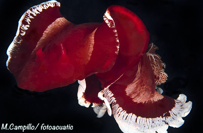 Este es el caso de Hexabranchus sanguineus , el mas grande de todos los nudibranquios conocidos que puede alcanzar los 40 cm. de longitud o incluso más. Su llamativo color rojo con toques de blanco en sus márgenes y branquias y los movimientos que realiza cuando se desplaza por el agua, le ha dado el nombre vulgar conocido en el mundo entero de “SPANISH DANCER,”, LA BAILARINA ESPAÑOLA.