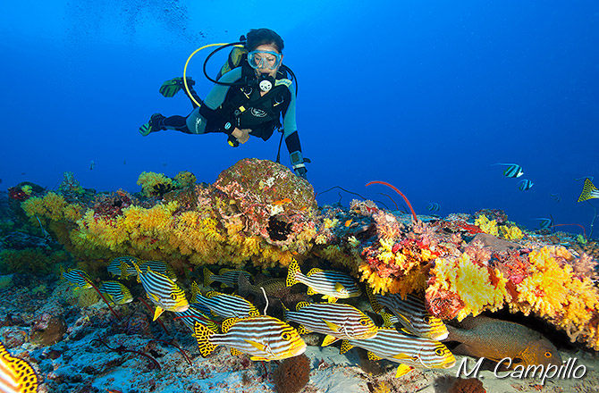 Es por eso que estos llamativos peces, que deben su nombre vulgar a sus grandes labios carnosos, se reúnen en grupos de entre 10 y 20 individuos. Prácticamente inmóviles, se les ve apostados contra corriente o al refugio de formaciones coralinas como en este caso. Ante la llegada de "un intruso" que mejor opción que la de esconderse bajo una cornisa repleta de coral amarillo para completar su camuflaje.