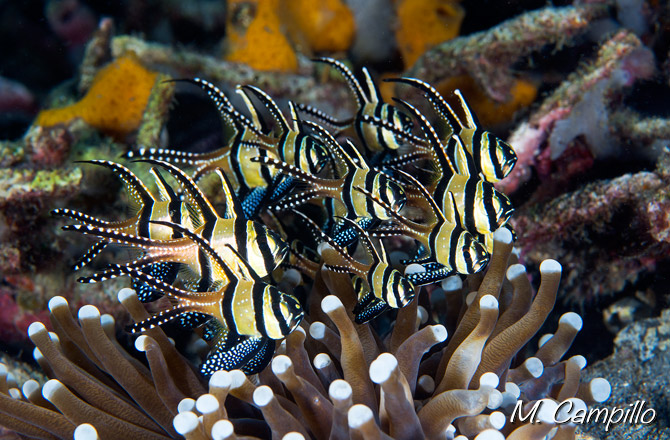 Los juveniles forman grupos numerosos que se protegen entre las espinas de erizos, anémonas y corales, pero cuando maduran sexualmente se convierten en individuos solitarios para el momento de la reproducción. Como en el caso de todas las especies de peces cardenales, el macho incuba los peces en la boca, pero a diferencia del resto de las especies de apogónidos, mantienen las larvas en la boca unos 10 días más una vez que los huevos han eclosionado. Su baja tasa de fecundidad (unos 50 huevos por puesta, frente a los cientos de miles de otras especies) al carecer de fase larvaria pelágica en su desarrollo y su firme establecimiento en ciertos microhábitats cerca de los fondos, explica su limitada distribución geográfica.