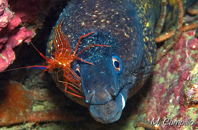 La morena más típica de las aguas mediterráneas, Muraena Helena, es un potente depredador nocturno que se alimenta de pequeños peces, pulpos y crustáceos, por lo que no deja de sorprender el hecho de ver a uno de sus bocados favoritos paseándose inmune por su cabeza. Los dos llegan a un acuerdo temporal de beneficio mutuo en el que el pequeño camarón Lysmata Seticauda se alimenta de pequeños parásitos, piel muerta y los retos de comida de la morena y ésta se beneficia de mantener su cuerpo libre de parásitos e impurezas.