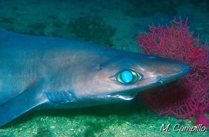 El tiburón Quelvacho, Centrophorus granulosus, vive en los fondos limosos del Mediterráneo y el Atlántico a partir de los 60 y hasta los 1.200 m de profundidad. Con una talla media de 1,50 metros, tiene grandes ojos con la pupila verde como otras especies de escualos de las profundidades. Nos topamos con el en una inmersión en las costas de Granada y fue una suerte poderlo fotografiar aunque os explicaré las especiales circunstancias que lo permitieron. En cualquier caso es un documento inédito de una especie que no ha sido antes avistado ni fotografiado bajo el agua.