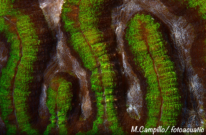 Pero las formaciones de coral duro, también llamado coral piedra, son estructuras formadas por seres vivos, los pólipos, que producen un esqueleto calcáreo externo al que se adhieren fuertemente. Las sucesivas generaciones de pólipos construyen capa sobre capa sobre los restos de calcita de sus predecesores y de esta manera el arrecife va creciendo milímetro a milímetro a lo largo de milenios. No en vano , los corales pétreos son conocidos como “los constructores de los arrecifes”.